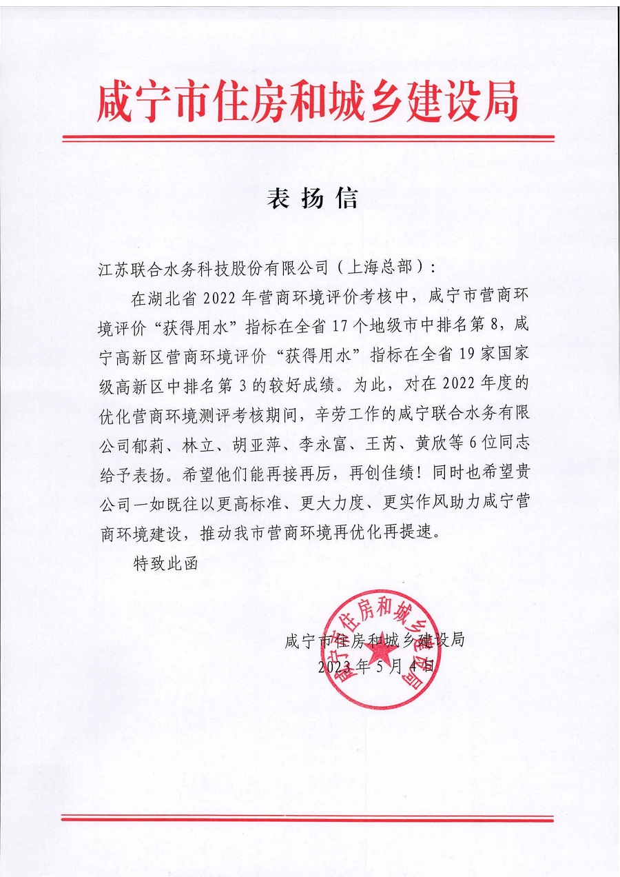 近日,湖北省咸宁市住房和城乡建设局向联合水务发来一封表扬信,对江苏联合水务科技股份有限公司旗下全资子公司咸宁联合水务有限公司2022年度优秀营商环境小组成员进行通报表扬,他们分别是客户服务副总经理郁莉、客户服务部经理林立、市场拓展部副经理胡亚萍、客户服务部抄收主管李永富、市场拓展部市场专员王芮、行政管理部行政助理黄欣。此次通报表扬,彰显了湖北省咸宁市住建局对联合水务履行企业责任、助力咸宁市营商环境建设的充分肯定与高度赞扬。