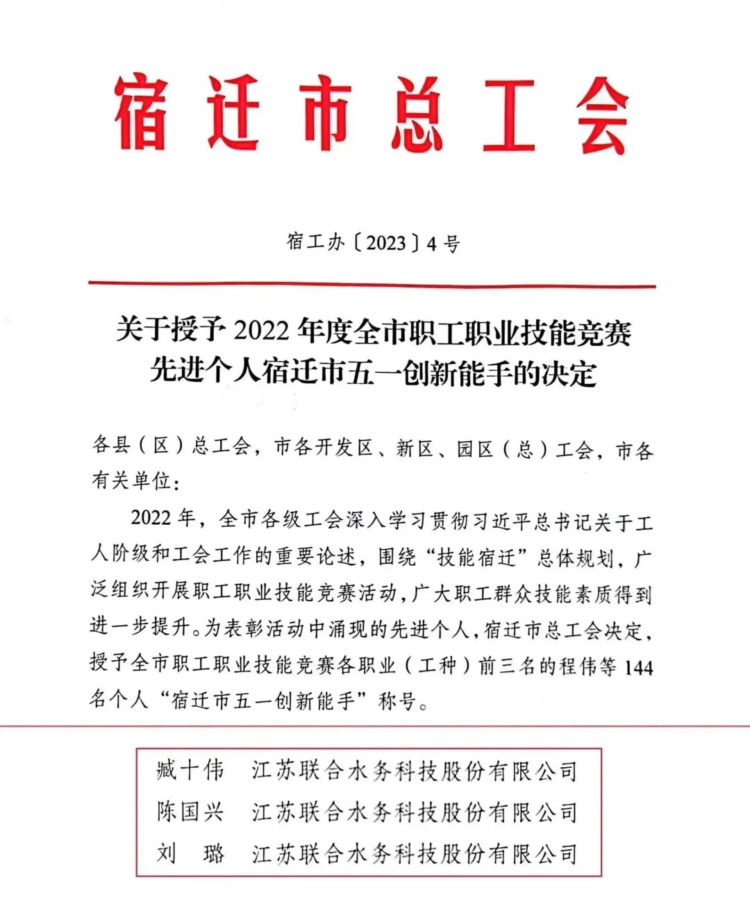 近日,江苏省宿迁市总工会举行表彰活动,向2022年度全市在劳动和技能竞赛等活动中涌现的先进集体和个人给予了崇高的赞誉。联合水务宿迁供水公司多名员工荣获“宿迁市五一劳动奖章”和“宿迁市五一创新能手”荣誉称号。这一荣耀的加冕,既是对他们辛勤工作与诚实劳动的充分认可,也是对他们为城市发展作出卓越贡献的积极鼓励。 “宿迁市五一劳动奖章”获得者:臧十伟 “宿迁市五一创新能手”获得者:刘璐、臧十伟、陈国兴