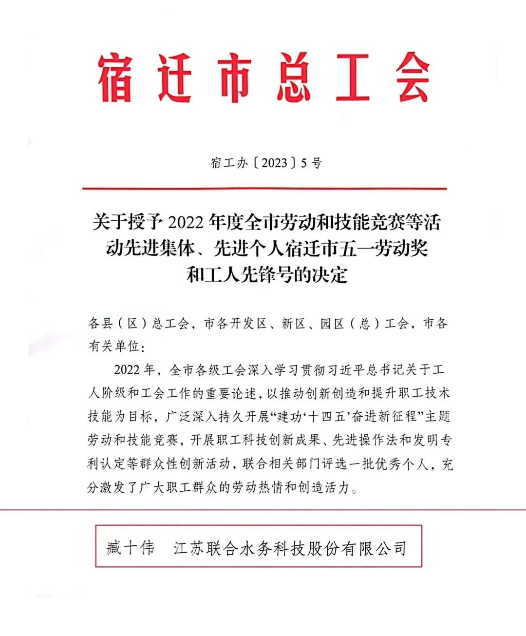 | 喜报!这些联合水务人荣获宿迁市“五一劳动奖章”和“五一创新能手”荣誉称号! | ||