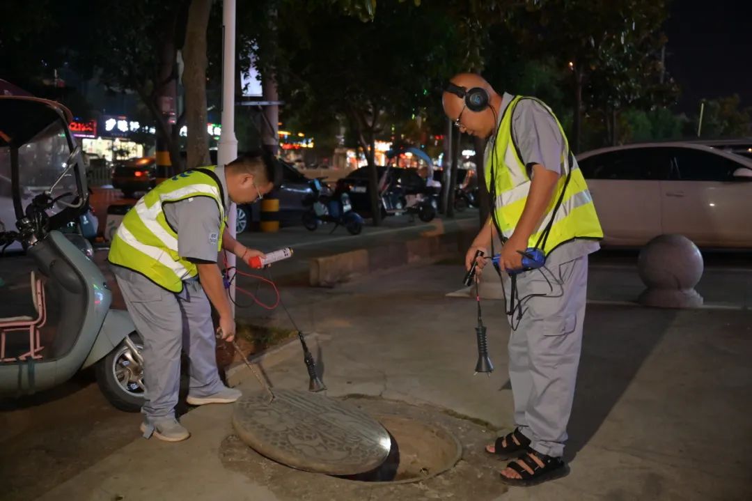 火“热”奋战,加强管网巡查 为进一步保障城区供水管网运行安全,及时发现管道暗漏点,咸宁联合水务管网探漏人员在炎炎夏日,沿着城区大街小巷对供水管道进行“体检”。有时,需要安静、车流量小的环境,他们就选择深夜出动,一手拿着听音杆,一手拿着手电筒,利用仪器检听供水管网运行情况,为能迅速判断是否漏水以及精准定位漏水点,有时需要反复探测十几次,力争将各类管道漏水隐患扼杀在萌芽中。同时,在供水高峰期,探漏人员还将常态化开展管网巡查,将责任层层落实到个人,力求件件有人管,项项有落实,事事出成效,保障供水管网的运行安全稳定。