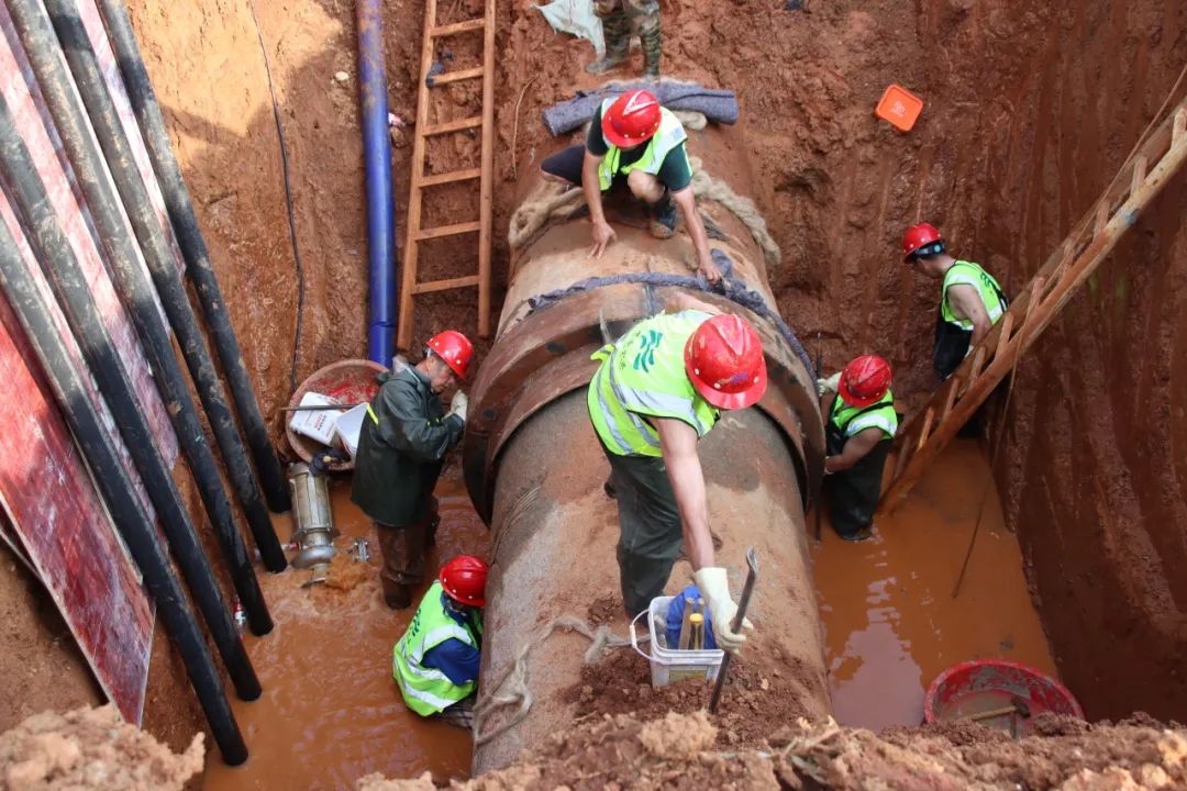 无惧“高”温,做好应急抢修 夏季作为一年之中的用水高峰期,季节的特殊性使得管道爆管、漏水现象发生频率较高,供水管道抢修量比其他时间段明显增加。7月12日,通江大道大屋吴附近DN1200mm供水管网因老化发生漏水,咸宁联合水务多部门联动火速赶赴现场了解情况,并迅速启动应急抢修预案,第一时间紧急调配挖掘机、发电车、抽水机等大型抢修机具进行增援,安排应急抢修专班赶往事发现场,迅速开展现场勘察、确定漏点具体情况、设立全面安全防护措施等抢修前期工作。在抢修期间,面对管径大、时间紧、施工作业环境复杂等诸多难题,抢修人员齐心配合、攻坚克难,井然有序地开展漏点测定、降水开挖、焊接维修、冲洗试压等一系列抢修和恢复工作,天气炎热,施工人员早已汗流浃背,但他们不畏艰难酷暑,坚守岗位,历经三十六个小时的昼夜奋战,完美完成DN1200主管道的维修和保养,未对城区供水造成任何不良影响。