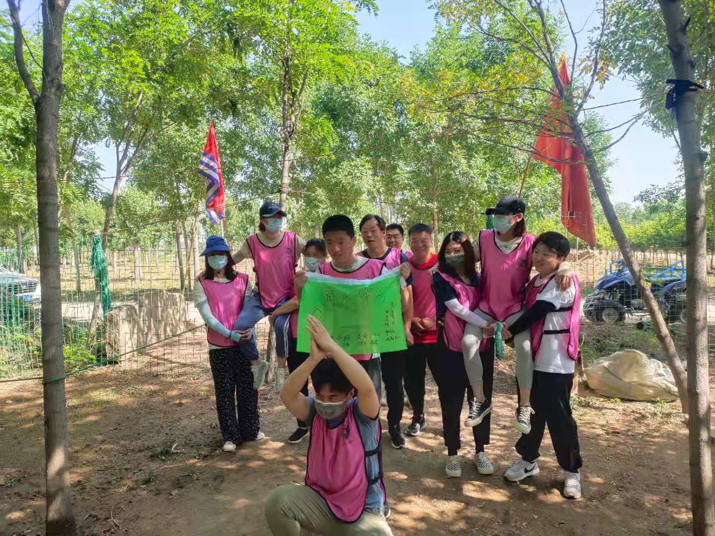 图:团建合影 早上8:30,全员集合完毕,整装到达襄汾沁馨园拓展培训基地。 教练按照公司完成小组的分配,换队服,“战队”雏形成立。经过破冰项目“桃花朵朵开”,打破坚冰,开始全天活动。 正式训练前,由队员选出队长,在选出队长的引领下一起商讨出各自队名,队徽和队歌。